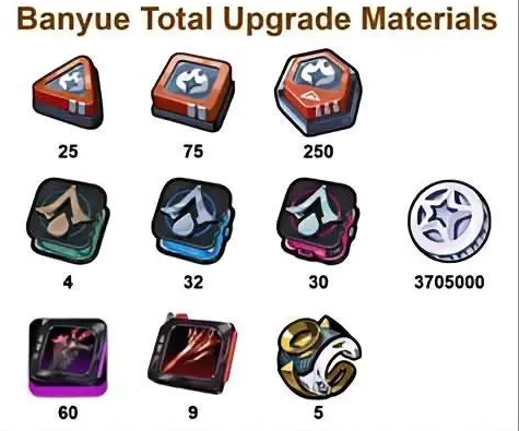 l Material Types: Banyue's upgrades require rare Fire-based materials, W-Engine enhancement items, and specific character enhancement items unique to him.
