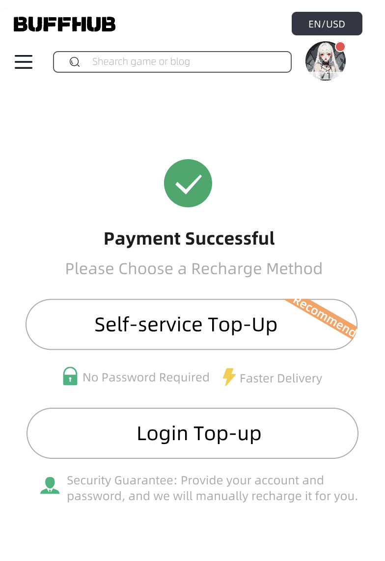 В настоящее время в игре поддерживается услуга самостоятельного пополнения счета. Мы рекомендуем выбирать 【Самостоятельное пополнение счета】 для более удобного и быстрого пополнения.
